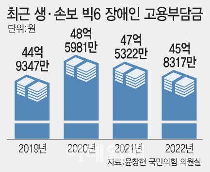 윤창현 국민의힘 의원이 금융감독원으로부터 제출받아 분석한 ‘보험회사 장애인 고용현황’ 자료에 따르면 국내 주요 생명보험사·손해보험사 ‘빅6(삼성생명·한화생명·교보생명·삼성화재·현대해상·DB손해보험)’은 지난 4년간(2019년~2022년) 총 186억8969만원의 장애인 고용부담금을 납부했다. 이들 보험사들이 매년 장애인 의무 고용률을 지키지 않아 낸 부담금이 연평균 46억원을 넘어선 셈이다.