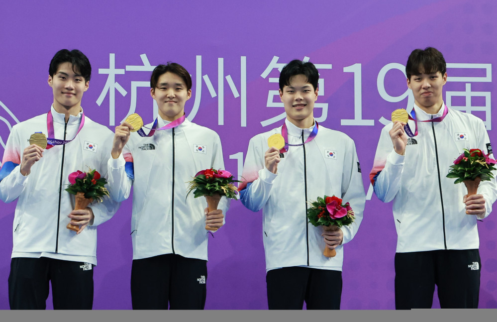 황선우, 김우민, 이호준, 양재훈가 25일 중국 항저우 올림픽 스포츠센터 수영장에서 열린 2022 항저우 아시안게임 수영 이틀째, 남자 800m 계영 결승에서 금메달을 획득한 뒤 기뻐하고 있다. |