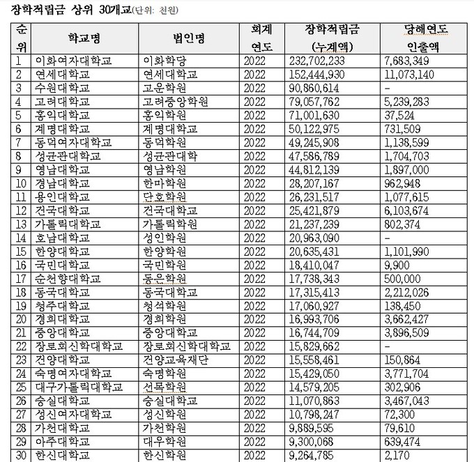 누계 장학적립금이 많은 상위 30개 대학 중 지난해 한 푼도 쓰지 않은 대학은 수원대와 호남대, 장로회신학대(158억3000만원, 장로회신학대학교) 3곳이었다. 연세대는 장학적립금 중 지난해 110억7300만원을, 이화여대는 76억8300만원을 장학금 지급 용도로 인출했다.