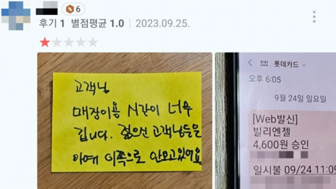 전날 한 온라인 커뮤니티에서는 '어르신이 카페에 좀 오래 앉았다고 받은 쪽지'라는 제목의 글이 퍼지며 논란이 됐다. 작성자는 "(전날 해당 카페 매장을 이용한) 아빠가 사장님으로부터 이런 쪽지를 받았다며 들고 오셨다"면서 카페 업주에게 받은 쪽지를 공개했다. 해당 쪽지에는 '고객님 매장 이용 시간이 너무 깁니다. 젊으신 고객님들은 아예 이쪽으로 안 오고 있어요'라고 적혀 있었다.