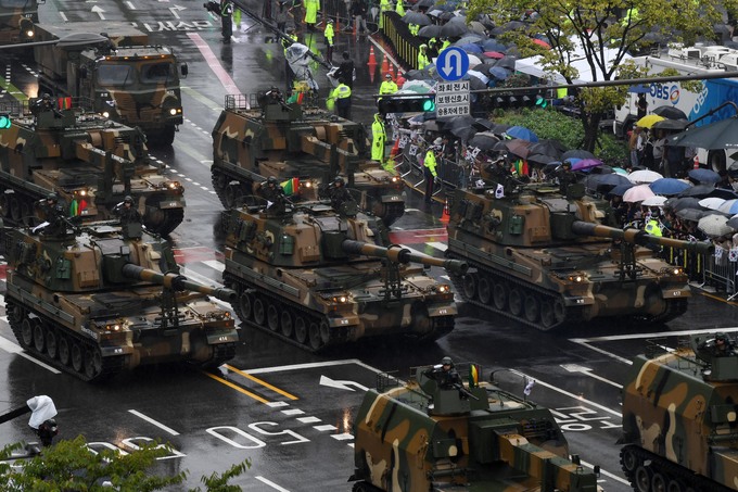 26일 오전 경기도 성남시 서울공항에서 열린 제75주년 국군의 날 기념식에서 장비부대가 분열하고 있다. 사진공동취재단 |
