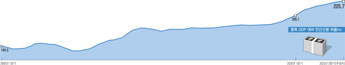 한은이 26일 발표한 ‘금융안정 상황’을 보면 올해 2분기 말 명목GDP 대비 민간 신용(자금순환통계상 가계·기업 부채 합) 비율(추정치)은 225.7%로 집계됐다. 올 1분기 말(224.5%)보다 1.2%포인트 높은 역대 최고 수준이다.
