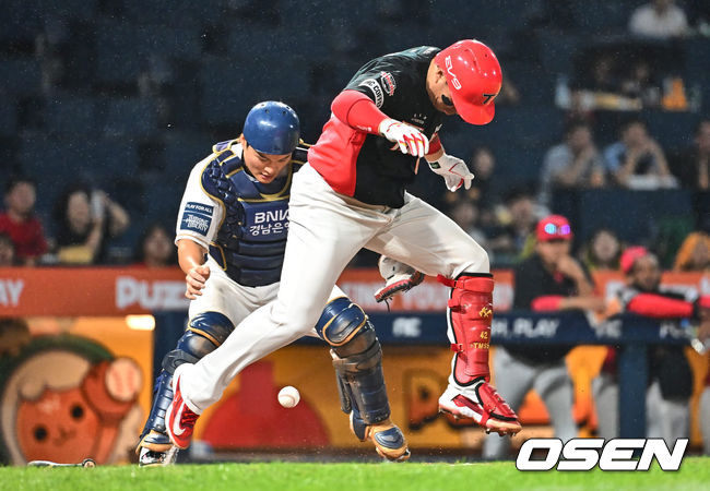 KIA 타이거즈 김태군이 7회초 1사 2,3루 번트를 대고 튀어 오른 공을 피하고 있다. 2023.09.26 / foto0307@osen.co.kr