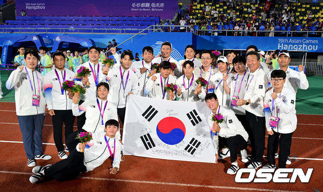 시상식을 마치고 은메달을 거머쥔 한국 남자 7인제 럭비 선수단과 최윤 아시안게임 선수단장을 비롯한 관계자들이 기념촬영을 하고 있다. 2023.09.26 / dreamer@osen.co.kr