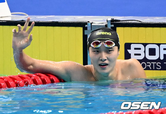 한국 대표팀 김우민이 경기를 마친 뒤 관중에게 인사하고 있다. 김우민은 15분01초07을 기록, 은메달을 획득했다. 2023.09.26 / ksl0919@osen.co.kr