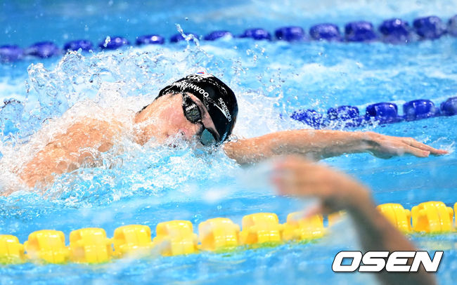 [OSEN=항저우(중국), 김성락 기자] 26일 오후 중국 항저우 올림픽 스포츠센터 수영장에서 '제19회 항저우아시안게임' 수영 남자 혼계영 400m(배영 이주호~평영 최동열~접영 김영범~자유형 황선우) 결승전 경기가 열렸다.