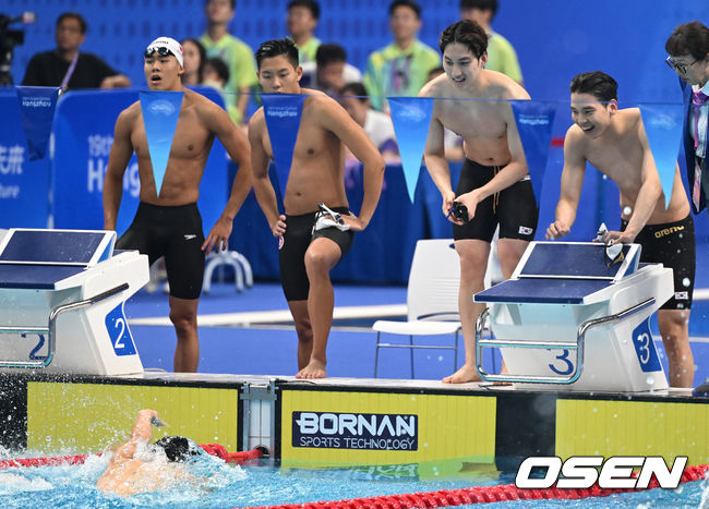 [OSEN=항저우(중국), 김성락 기자] 26일 오후 중국 항저우 올림픽 스포츠센터 수영장에서 '제19회 항저우아시안게임' 수영 남자 혼계영 400m(배영 이주호~평영 최동열~접영 김영범~자유형 황선우) 결승전 경기가 열렸다.