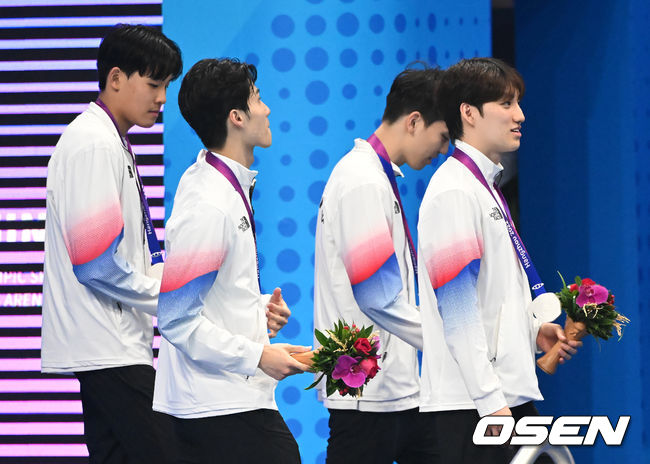 [OSEN=항저우(중국), 김성락 기자] 26일 오후 중국 항저우 올림픽 스포츠센터 수영장에서 '제19회 항저우아시안게임' 수영 남자 혼계영 400m(배영 이주호~평영 최동열~접영 김영범~자유형 황선우) 결승전 경기가 열렸다.