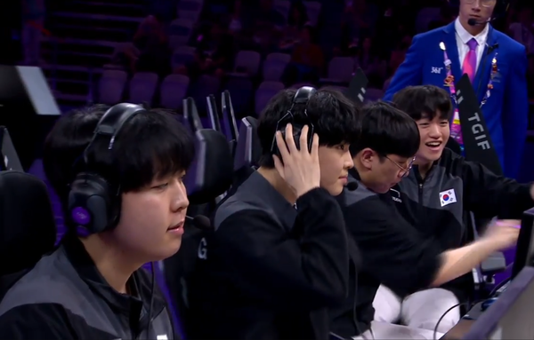한국은 이날 '제우스' 최우제(19·T1) '카나비' 서진혁(23·징동 게이밍) '쵸비' 정지훈(22·젠지) '룰러' 박재혁(25·징동 게이밍) '케리아' 류민석(21·T1)으로 경기에 나섰다.