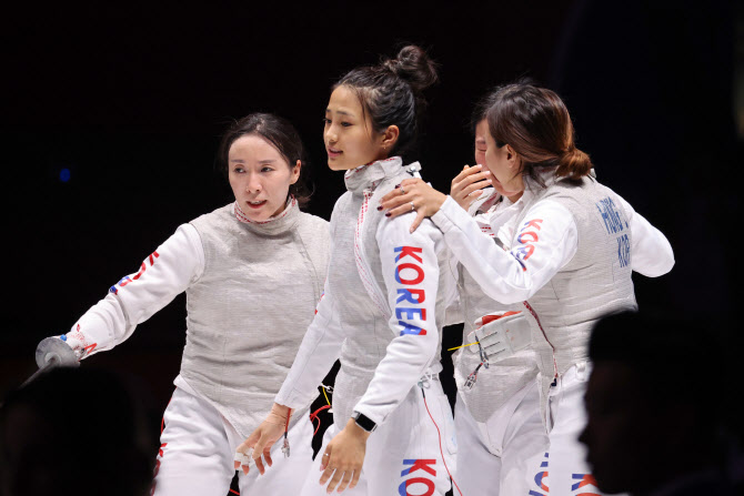 28일 중국 항저우 전자대학 체육관에서 열린 19회 항저우 아시안게임 펜싱 여자 플뢰레 단체 결승전에서 중국에게 패하며 은메달을 확정 지은 한국 선수들이 아쉬워하고 있다. 사진=연합뉴스 |