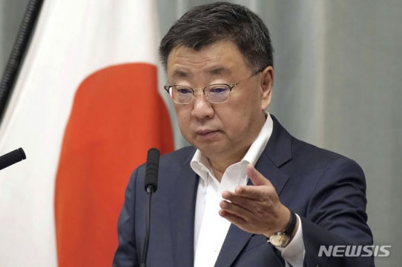 일본 정부는 지난 15일 북일 정상회담 조기 실현을 위한 총리 직할 고위급 협의를 실시하겠다며 정상회담 개최 의욕을 강조했다. 사진은 마쓰노 히로카즈 일본 관방장관이 지난 5월 29일 도쿄 총리 관저에서 기자회견을 열어 질문을 받는 모습. AP 자료사진 뉴시스 |
