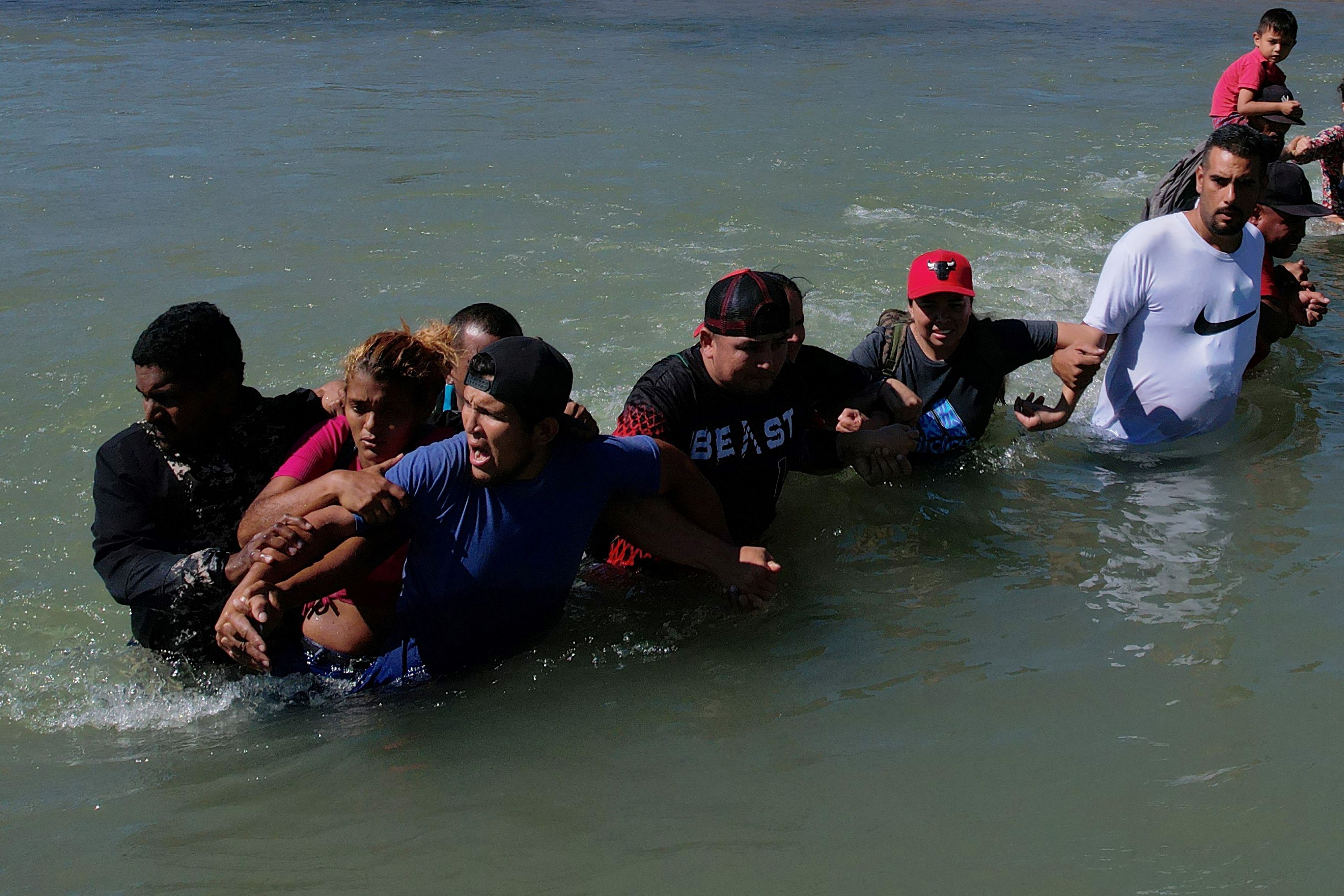 9월28일 불어난 물로 물살이 거세진 리오그란데 강을 헤치며 불법월경자들이 미국 텍사스주의 이글 패스로 넘어오고 있다./로이터 연합뉴스 |