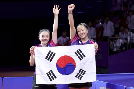 금메달을 따낸 뒤 태극기를 들고 기뻐하는 전지희(왼쪽)와 신유빈. 항저우=장진영 기자 |
