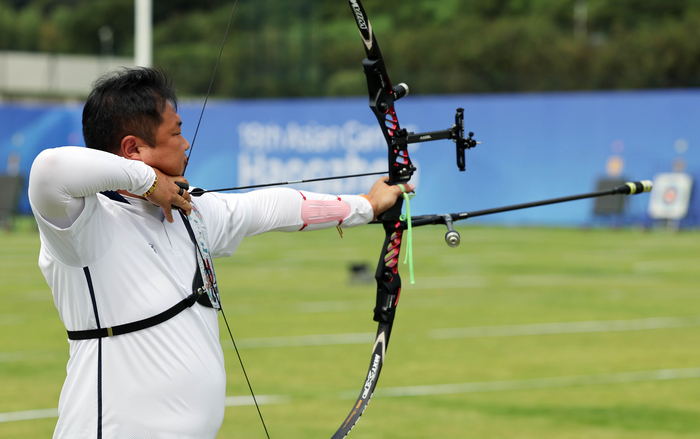 대한민국 양궁 대표팀 오진혁이 2일 오전 중국 저장성 항저우 푸양 인후 스포츠센터에서 열린 2022 항저우 아시안게임 양궁 리커브 남자 단체전 16강에 출전해 활시위를 당기고 있다. 2023.10.2 연합뉴스 |