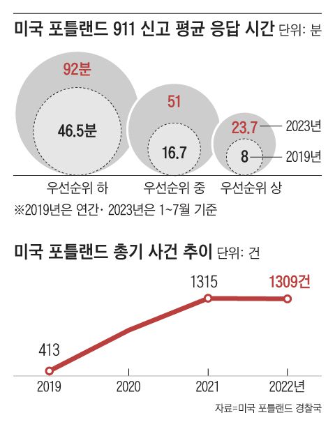 이 같은 현상의 배경으로 NYT는 2020년부터 시작된 경찰 예산 삭감 움직임을 꼽았다. 당시 흑인 남성 조지 플로이드가 경찰의 과잉 진압으로 숨지자 ‘경찰 예산을 끊어라(Defund the police)’라는 요구가 미국 전역에 빗발쳤고, 주요 도시에서 잇달아 경찰 예산을 삭감하면서 경찰 대응력이 약화됐다는 것이다. 포틀랜드시 또한 2020년 주 경찰국 예산을 1000만달러 이상 삭감했다. 이후 치안 공백이 발생하자 시는 관련 예산을 복구시키고 신규 채용에 대한 보너스를 제공하는 등 경찰력 강화에 나섰지만 여전히 역부족인 상황이다. NYT는 “새로운 경찰관을 고용하고 훈련하는 데 일반적으로 18개월이 걸렸고, 그동안 시내 전역을 순찰하는 경찰관은 12명 미만인 경우가 많았다”고 전했다. 범죄 신고 전화도 제때 닿지 않고 있다. 포틀랜드시 경찰국에 따르면, 올해 1~7월 평균 911 신고 응답 소요 시간(우선순위 상 사안 기준)은 23.8분으로 2019년(8분)의 3배다.