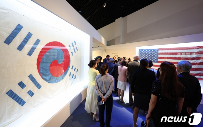 지난달 21일 서울 종로구 대한민국역사박물관 기획전시실에서 열린 한미동맹 70주년 기념 특별전 '동행' 개막식에서 관계자들이 데니 태극기와 주한미군 의장대가 사용했던 성조기를 보고 있다. /사진=뉴스1 |