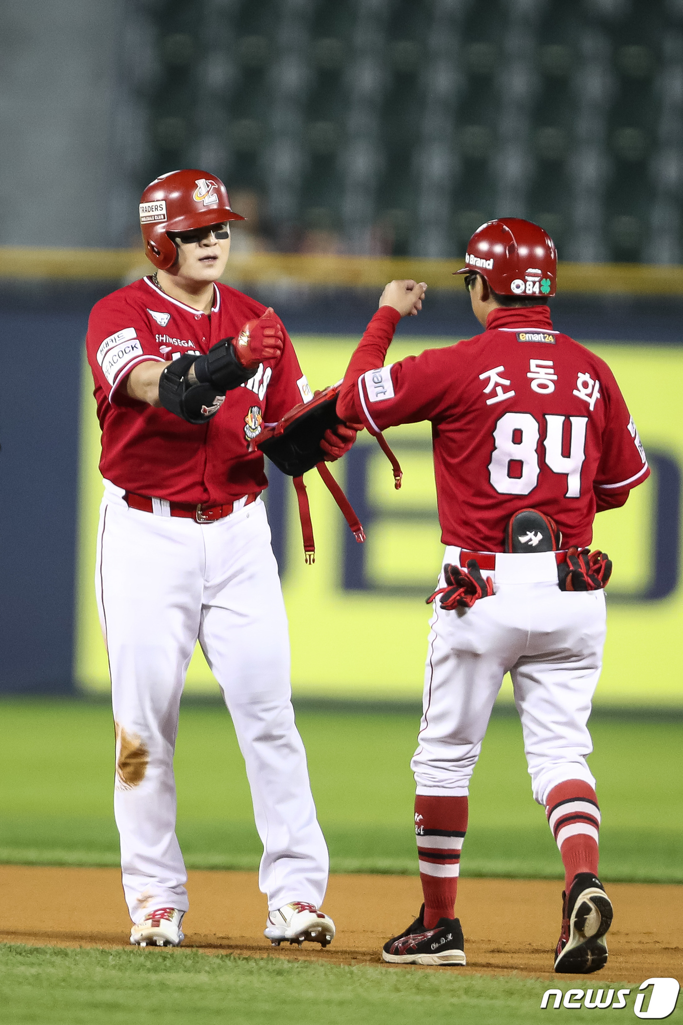 (서울=뉴스1) 유승관 기자 = 16일 서울 송파구 잠실야구장에서 열린 프로야구 '2023 신한 SOL KBO리그' SSG 랜더스와 두산 베어스의 경기, 1회초 무사 상황 추신수가 2루타를 친 후 조동화 코치와 주먹을 맞대고 있다. 2023.10.16/뉴스1