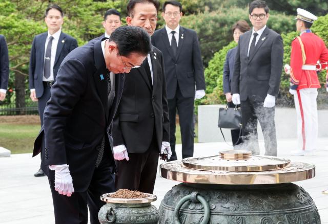 기시다 후미오 일본 총리가 지난 5월 서울 동작구 국립서울현충원을 방문, 현충탑에 분향하고 있다. [사진=사진공동취재단] |