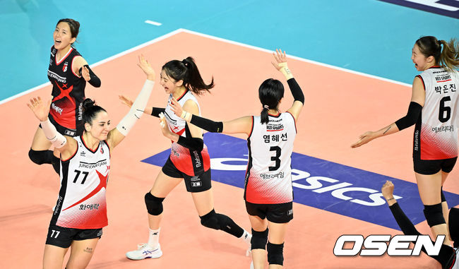 [OSEN=인천, 민경훈 기자]2세트 공격에 성공한 정관장 선수들이 기뻐하고 있다. 2023.10.26 / rumi@osen.co.kr |