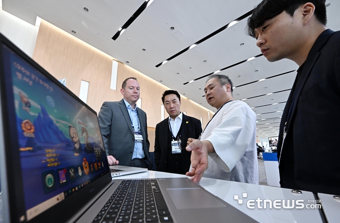 2023 글로벌 블록체인 인천 컨퍼런스가 인천광역시 주최, 인천테크노파크 주관으로 30일 인천 연수구 송도컨벤시아에서 열렸다. 참관객이 아이피샵의 블록체인 게임 '오당탕탕 스매시'를 살펴보고 있다.