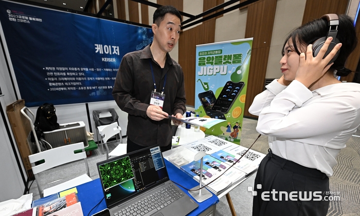 2023 글로벌 블록체인 인천 컨퍼런스가 인천광역시 주최, 인천테크노파크 주관으로 30일 인천 연수구 송도컨벤시아에서 열렸다. 참관객이 케이저의 저작권 통합 음악 콘텐츠 플랫폼 '직퍼'를 살펴보고 있다.
