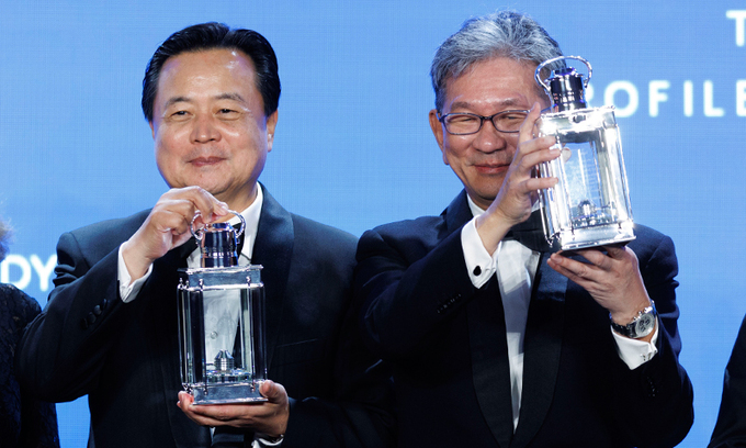 미국 보스턴 존 F 케네디 재단 도서관 겸 박물관에서 29일(현지시간) 열린 ‘용기 있는 사람들 상’ 시상식에서 특별 국제 수상자인 윤석열 대통령의 상을 조현동 주미대사(왼쪽)가 대리 참석해 수상하고 있다. 보스턴=EPA연합뉴스 |