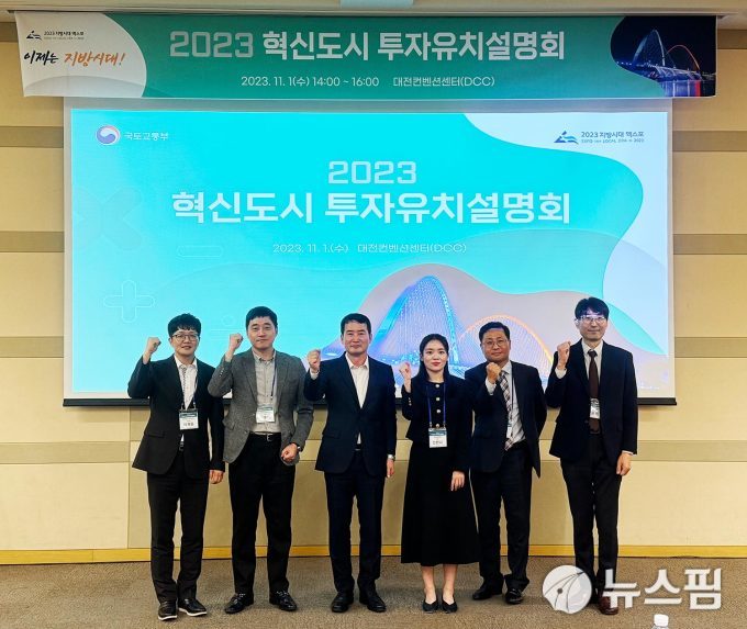 '2023 혁신도시 투자유치 설명회'에서 LX한국국토정보공사 ESG경영처 황우석 차장(왼쪽에서 두 번째) 등이 기념촬영했다.[사진=LX] 2023.11.02 gojongwin@newspim.com |