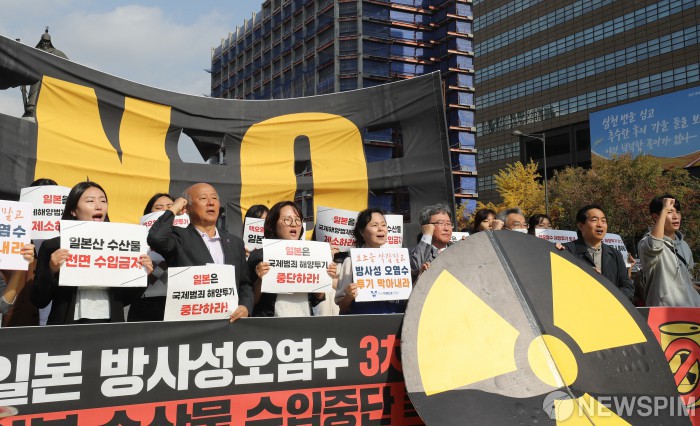 [서울=뉴스핌] 최지환 기자 = 일본방사성오염수해양투기저지공동행동과 시민단체 회원들이 2일 오전 서울 종로구 광화문 광장에서 열린 후쿠시마 핵 오염수 3차 해양투기 규탄 및 일본 수산물 수입중단 촉구 기자회견에서 구호를 외치고 있다. 2023.11.02 choipix16@newspim.com