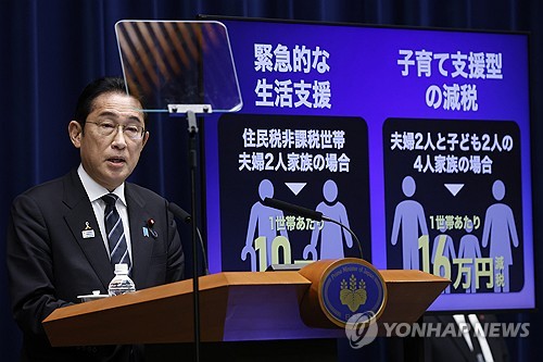 기시다 총리는 감세와 관련해 내년 6월께 소득세와 주민세를 합해 1인당 4만엔(약 35만원)씩 세금을 줄여주겠다고 발표했다.