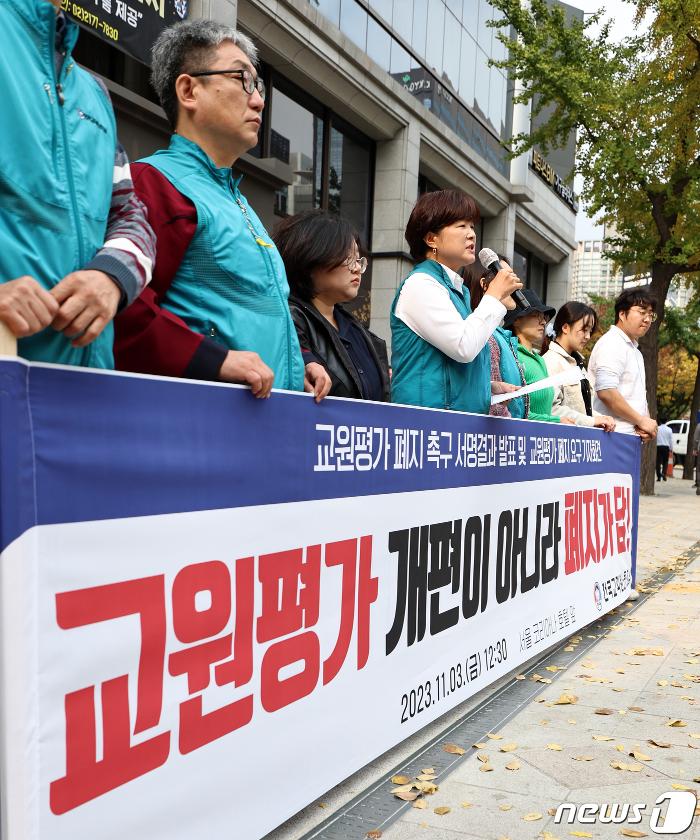 (서울=뉴스1) 구윤성 기자 = 전국교직원노동조합(전교조) 회원들이 3일 오후 교육부의 교원능력개발평가 개편을 위한 현장 교원 정책 태스크포스 회의가 열리는 서울 중구 코리아나호텔 앞에서 기자회견을 열고, 교원능력개발평가 폐지를 촉구하고 있다. 2023.11.3/뉴스1