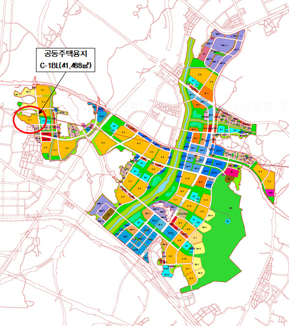 이번에 공급하는 공동주택용지는 C-1블록 1필지로, 면적 4만1488㎡ 및 593가구 규모이며, 건폐율 50% 이하, 용적률 200% 이하이다.