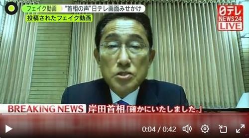 양복 차림의 기시다 총리가 등장해 성적 발언을 하는 것처럼 제작된 3분 43초 분량의 동영상에는 현지 민영 방송 니혼테레비(닛테레) 뉴스 프로그램 로고가 표시돼 있다.