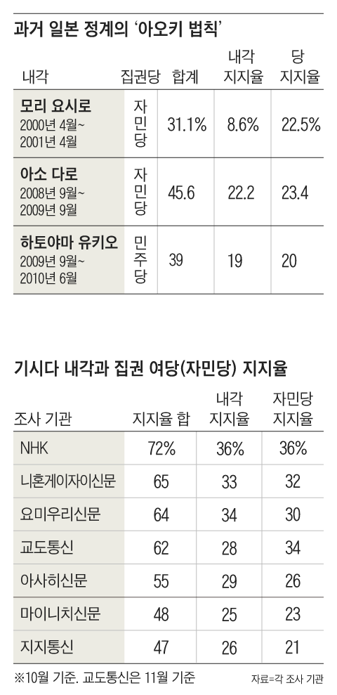 아오키 미키오 전 관방장관이 주창한 ‘아오키의 법칙’은 내각 지지율과 집권당의 지지율 합이 50% 아래로 내려가면 정권이 와해된다는 것이다. 의원내각제인 일본 정치권에서 ‘총리 사퇴와 정권 붕괴’의 시금석으로 통하는 경험칙이다. 실제로 모리 내각(내각 지지율 8.6%, 자민당 지지율 22.5%)과 아소 내각(내각 22.2%, 자민당 23.4%)이 붕괴 직전에 지지율 합이 50% 아래로 내려갔고, 민주당 정권인 하토야마 내각(내각 19%, 민주당 20%)도 마찬가지였다.