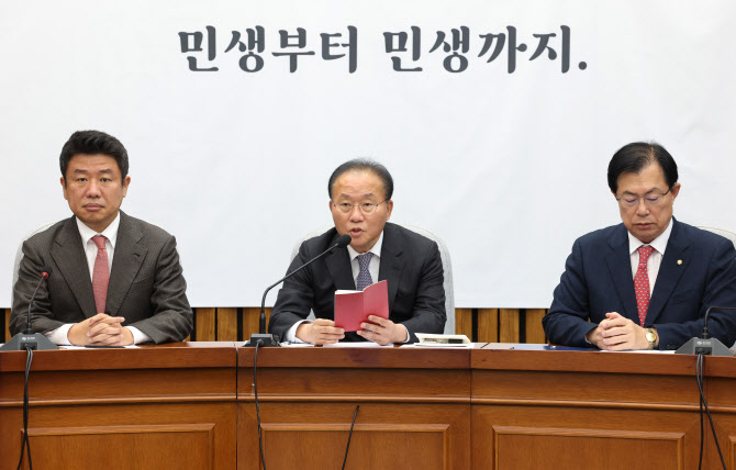 윤재옥(가운데) 국민의힘 원내대표가 10일 서울 여의도 국회에서 열린 원내대책회의에서 발언을 하고 있다. (사진=뉴스1) |