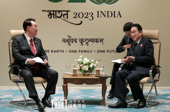 [서울=뉴스핌] 윤석열 대통령이 10일(현지시간) 뉴델리 바라트 만다팜 국제컨벤션센터에서 기시다 후미오 일본 총리와 한일 정상회담을 하고 있다.[사진=대통령실] 2023.09.10 photo@newspim.com |