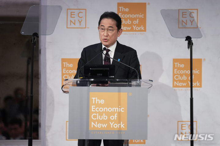 [뉴욕=AP/뉴시스]사진은 기시다 후미오 일본 총리가 지난 9월21일(현지시간) 미국 뉴욕에서 열린 뉴욕경제클럽 주최 행사에서 연설하는 모습. 2023.11.14. |