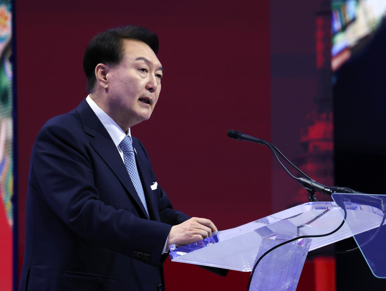 아시아태평양경제협력체(APEC) 정상회의 참석차 미국을 방문한 윤석열 대통령이 15일(현지시간) 샌프란시스코 모스코니 센터에서 열린 APEC CEO 서밋에서 기조연설을 하고 있다. [연합] |