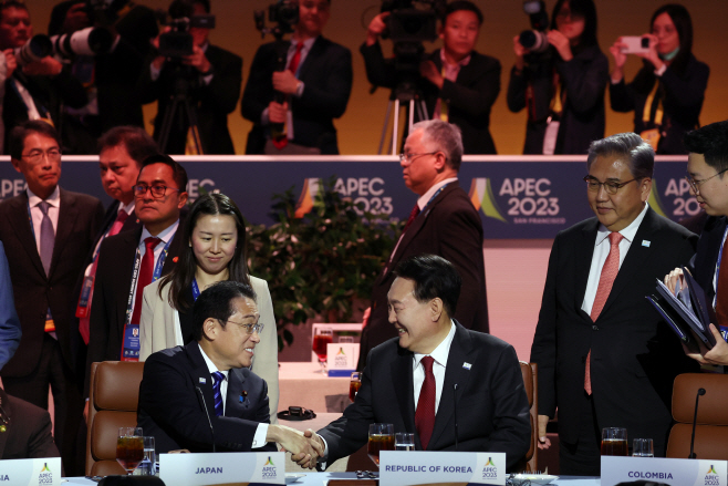 윤석열 대통령이 16일(현지시간) 미국 샌프란시스코 모스코니센터에서 열린 아시아태평양경제협력체(APEC) 정상회의 제1세션에서 기시다 후미오 일본 총리와 악수하고 있다. /연합뉴스 |
