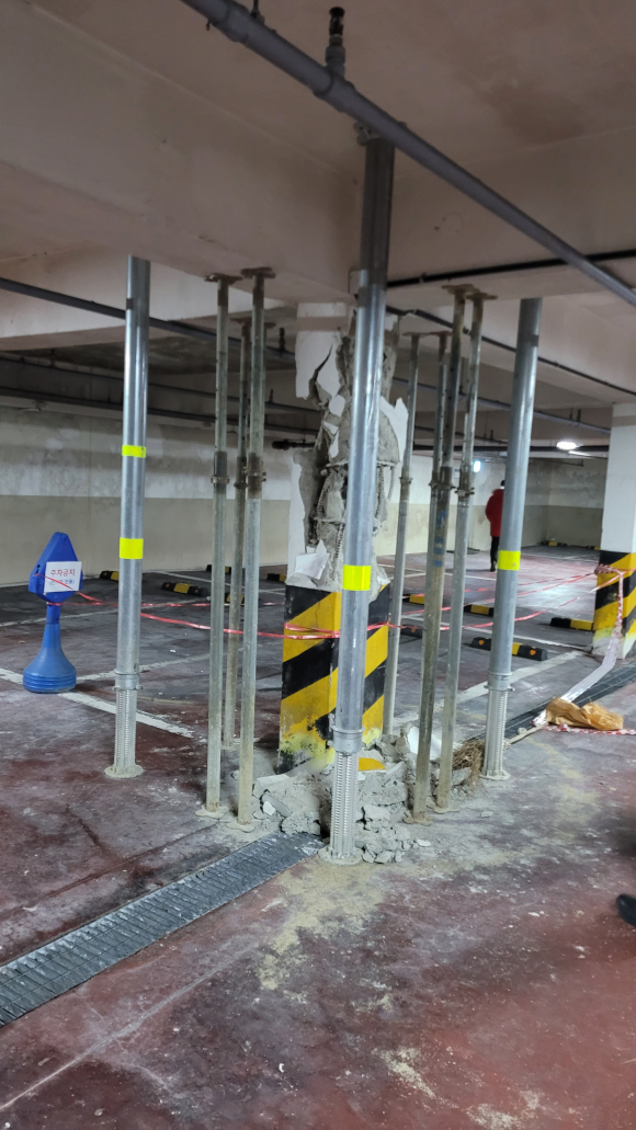 이날 시와 경찰에 따르면 지하주차장의 기둥 상부가 무너지면서 철근이 노출되는 등 붕괴 조짐을 보였다.