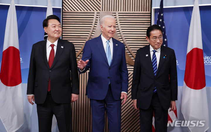 [샌프란시스코=뉴시스] 조수정 기자 = 아시아태평양경제협력체(APEC) 정상회의 참석차 미국을 방문 중인 윤석열 대통령이 16일(현지시간) 샌프란시스코 모스코니센터 미 대통령 양자회담장에서 열린 한미일 정상 회동에서 조 바이든 미국 대통령, 기시다 후미오 일본 총리와 기념촬영하고 있다. 2023.11.17. chocrystal@newsis.com |