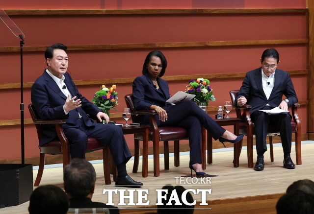 윤석열 대통령은 17일(현지시간) 아시아태평양경제협력체(APEC) 정상회의 참석 계기에 스탠퍼드대학교에서 한일 정상 좌담회에 참석해 한일, 한미일 간 첨단기술과 청정에너지 등 협력의 필요성을 강조했다. /뉴시스 |