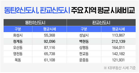 판교신도시는 더욱 큰 차이가 나타나고 있다. 판교신도시가 있는 성남시 평균 시세는 11억3867만원인데 반해 판교신도시 시범단지가 위치한 백현동 평균 시세는 무려 21억2139만원으로 10억원 가량 비싸다. 삼평동, 판교동 등 판교신도시 다른 동들과 비교해도 평균 시세 차이가 수억 원씩 차이가 난다.