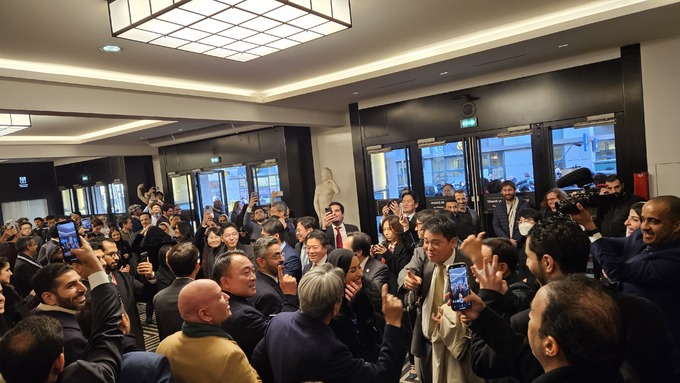 한덕수 국무총리와 최태원 대한상의 회장이 28일 오후(현지시간) 프랑스 파리 외곽 팔레 데 콩그레에서 열린 제173차 국제박람회기구(BIE) 총회에서 2030년 세계박람회 개최지 투표 결과 부산이 탈락하자 아쉬워하며 서로 격려하고 있다. 연합 |