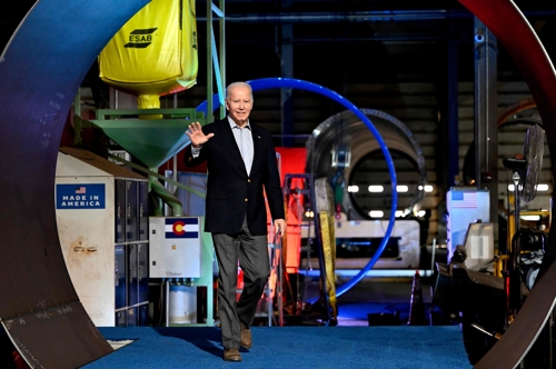 조 바이든 미국 대통령이 29일(현지시간) ‘바이드노믹스’ 성과를 강조하기 위해 콜로라도주 푸에블로의 CS윈드 풍력 터번 제조 공장을 방문해 무대에 오르고 있다. AFP연합뉴스 |