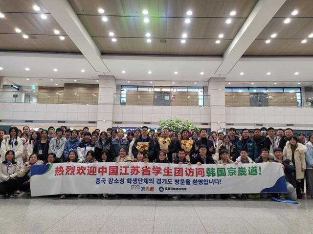 중국 장쑤성 청소년 단체 관광객들이 29일 인천국제공항에서 경기관광공사의 환영을 받고 있다. 경기관광공사 제공 |