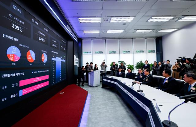 정황근 농림축산식품부 장관을 비롯한 참석자들이 30일 서울 서초구 aT센터에서 열린 농산물 온라인 도매시장 출범식에서 온라인 도매시장 거래 시연을 바라보고 있다. 뉴시스 |
