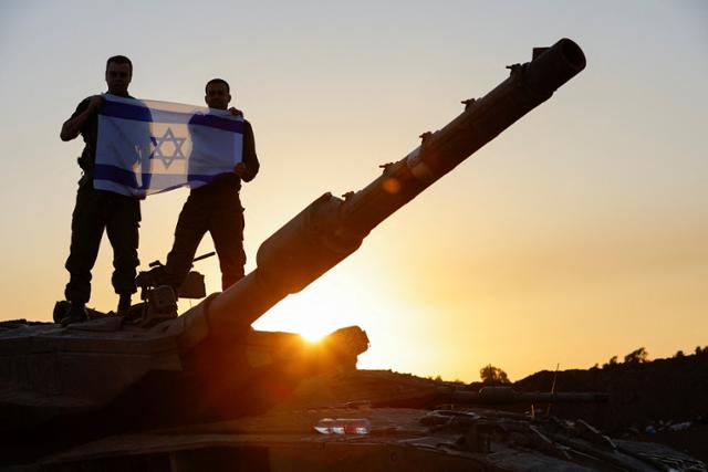 29일 이스라엘 남부 가자지구와의 접경 인근에서 이스라엘 군인들이 자국 국기를 들고 전차 위에 서 있다. 로이터 연합뉴스 |