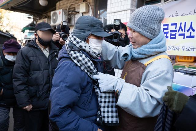 서울 최저기온이 영하 7도를 기록하며 매서운 한파가 찾아온 30일 서울 종로구 원각사 무료급식소에서 자원봉사자들이 어르신들에게 목도리를 둘러주고 있다. 뉴스1 |