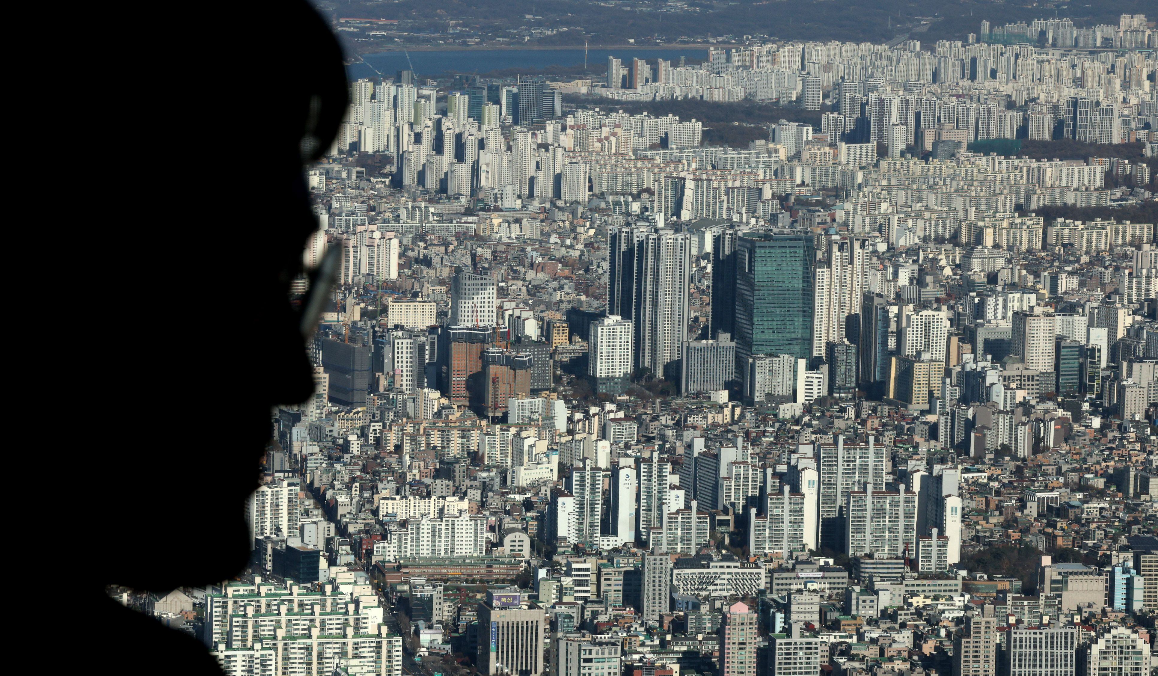 30일 오후 서울 송파구 롯데월드타워 전망대를 찾은 관람객이 아파트 단지를 바라보고 있다./뉴스1 |