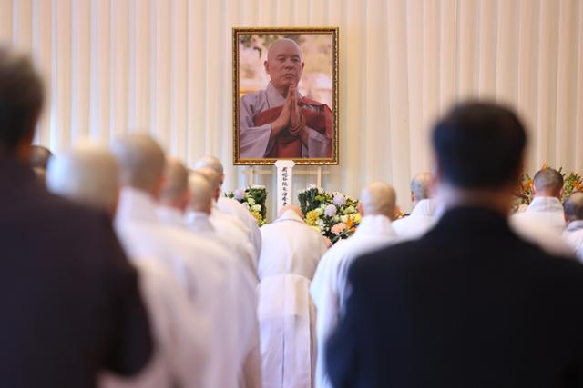 30일 서울 조계사 대웅전에 마련된 자승 스님 분향소에서 대한불교조계종 진우 스님을 비롯한 스님들이 추모 법회를 하고 있다. 연합뉴스 |
